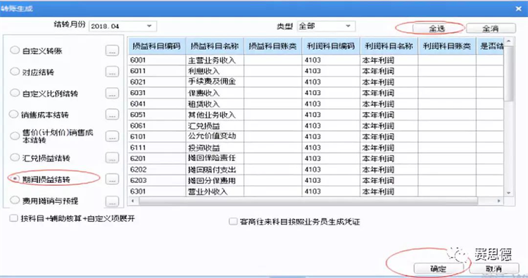 3.點(diǎn)開(kāi)轉(zhuǎn)賬生成,全選,然后確定就會(huì)自動(dòng)生成一張結(jié)轉(zhuǎn)損益的憑證。
