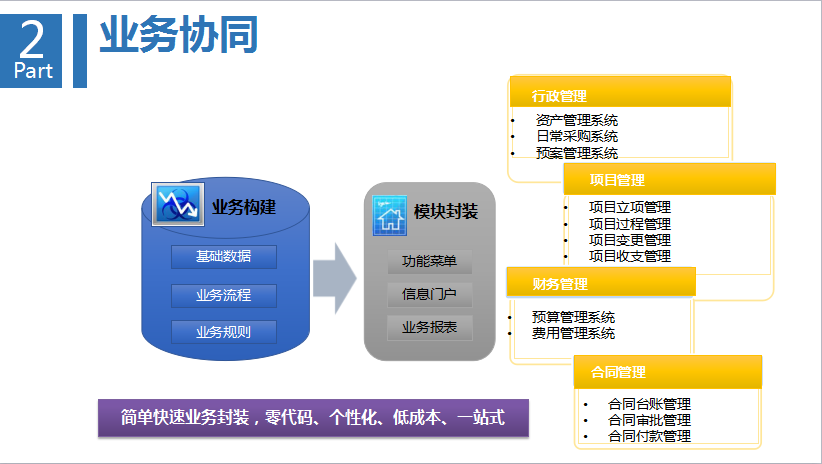 第二環(huán),是業(yè)務之間的協(xié)同,工作和業(yè)務又形成相互的融合。根據(jù)企業(yè)業(yè)務場景,為企業(yè)量身定制,覆蓋各個層面與領(lǐng)域。