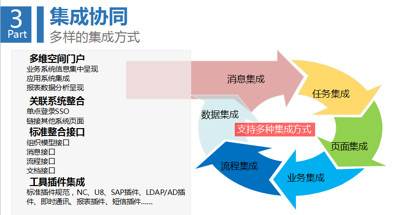 第三環(huán)是集成協(xié)同。任何企業(yè)都在多個系統(tǒng)中間,要思考多個系統(tǒng)之間怎么把數(shù)據(jù)共享起來?怎么把信息整合起來?怎么產(chǎn)生通用的信息門戶,能達到更高效的信息推送和自動推薦?